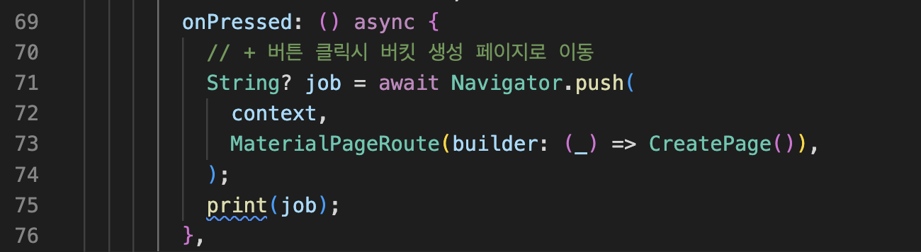 onPressed: () async { // + 버튼 클릭시 버킷 생성 페이지로 이동 String? job = await Navigator.push( context, MaterialPageRoute(builder: (_) => CreatePage()), ); print(job); },
