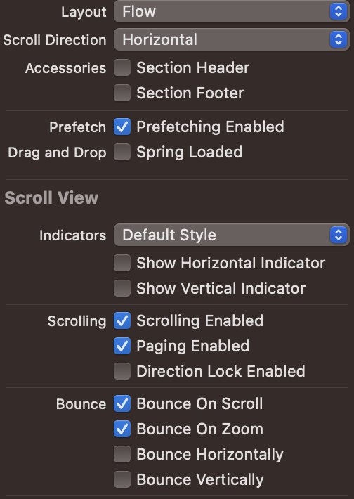 cf) 만약, 간단하게 양 옆 사이드 카드가 보이지 않고, 하나씩만 나오게 하고 싶다면 CollectionView를 클릭해서 아래처럼 조정해주면 된다! Paging을 통해 카드 하나씩 끊어주는 효과를 주고, indicator를 취소하여, 하단에 나오는 스크롤을 없애주면 된다!