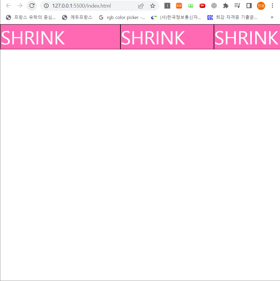 <!DOCTYPE html> <html lang="en"> <head> <meta charset="UTF-8"> <meta http-equiv="X-UA-Compatible" content="IE=edge"> <title>flex</title> <link rel="stylesheet" href="css/style.css"> </head> <body> <main> <section> <article>SHRINK</article> <article>SHRINK</article> <article>SHRINK</article> </section> </main> </body> </html>flex-grow와는 반대로 작은수를 지정하면 축소되는값이 줄어들어 여백값이 커진다!
