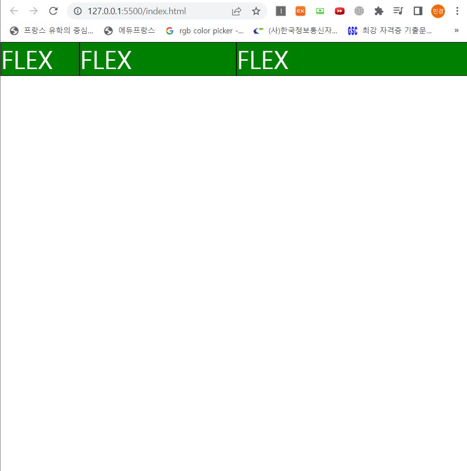 <!DOCTYPE html> <html lang="en"> <head> <meta charset="UTF-8"> <meta http-equiv="X-UA-Compatible" content="IE=edge"> <title>flex</title> <link rel="stylesheet" href="css/style.css"> </head> <body> <main> <section> <article>FLEX</article> <article>FLEX</article> <article>FLEX</article> </section> </main> </body> </html>@charset "UTF-8"; * { margin: 0px; padding: 0px; } section { width:100%; background: lightgreen; display: flex; } section article{ background-color: green; font-size:40px; color:#fff; border : 1px solid #000; } section article:nth-of-type(1) { flex:1; } section article:nth-of-type(2) { flex:2; } section article:nth-of-type(3) { flex:3; }