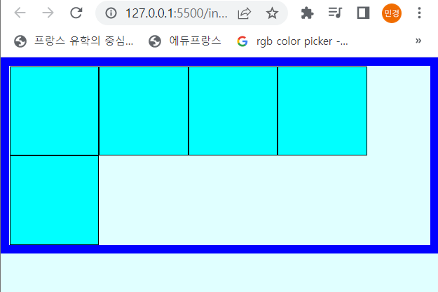 @charset "UTF-8"; * { margin: 0px; padding: 0px; } main{ width:100%; height:100vh; background: lightcyan; } /* flex는 레이아웃 요소를 부모요소에 설정 */ main section{ width:100%; height:100%; border:10px solid blue; box-sizing:border-box; display: flex; flex-flow:row wrap; justify-content: flex-start; } main section article{ width:100px; height:100px; background: aqua; border:1px solid #000; }- flex-end (오른쪽으로 배치)