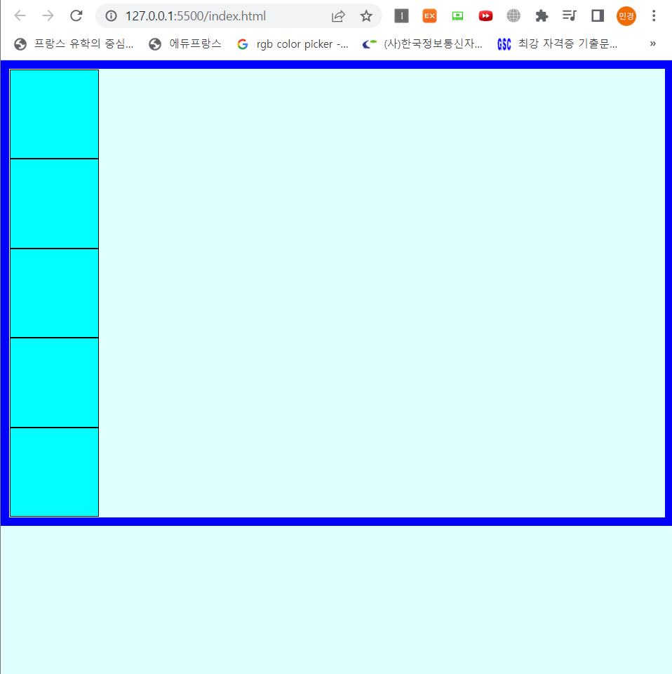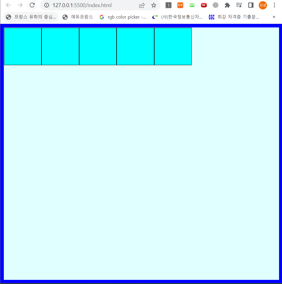 <!DOCTYPE html> <html lang="en"> <head> <meta charset="UTF-8"> <meta http-equiv="X-UA-Compatible" content="IE=edge"> <title>object-fit</title> <link rel="stylesheet" href="css/style.css"> </head> <body> <main> <section> <article></article> <article></article> <article></article> <article></article> <article></article> </section> </main> </body> </html>@charset "UTF-8"; * { margin: 0px; padding: 0px; } main{ width:100%; height:100vh; background: lightcyan; } /* flex는 레이아웃 요소를 부모요소에 설정 */ main section{ border:10px solid blue; /* 자식 넓이만큼 flex적용 */ display: inline-flex; /* 세로 방향으로 배치 */ flex-direction: column; } main section article{ width:100px; height:100px; background: aqua; border:1px solid #000; }